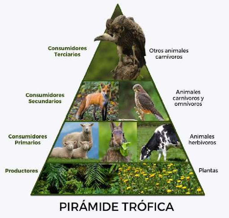 La pirámide trófica es una representación gráfica de la cantidad de energía, biomasa o número de organismos en cada nivel trófico: